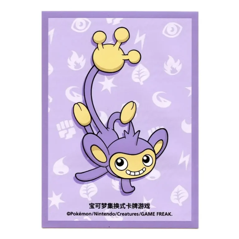 Officielle Pokemon TCG sleeves med Aipom-design. Pakken indeholder 65 sleeves fra det kinesiske Pokemon Center – perfekt til beskyttelse af dine kort.